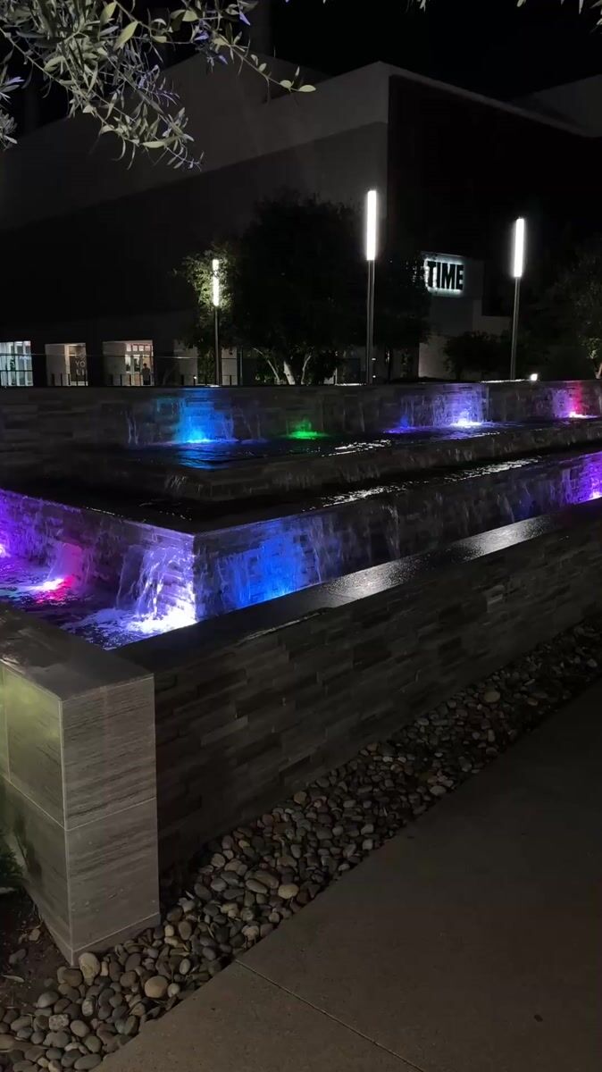 Topics: illuminated fountain, commercial signage, fitness center, italian restaurant, decorative lighting, commercial district, nighttime architecture, urban, commercial, daily life