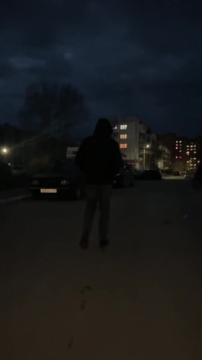 Topics: nighttime street, residential area, pedestrian walking, parked vehicle, blonde woman, electronic device, evening documentation, urban life, residential, daily life