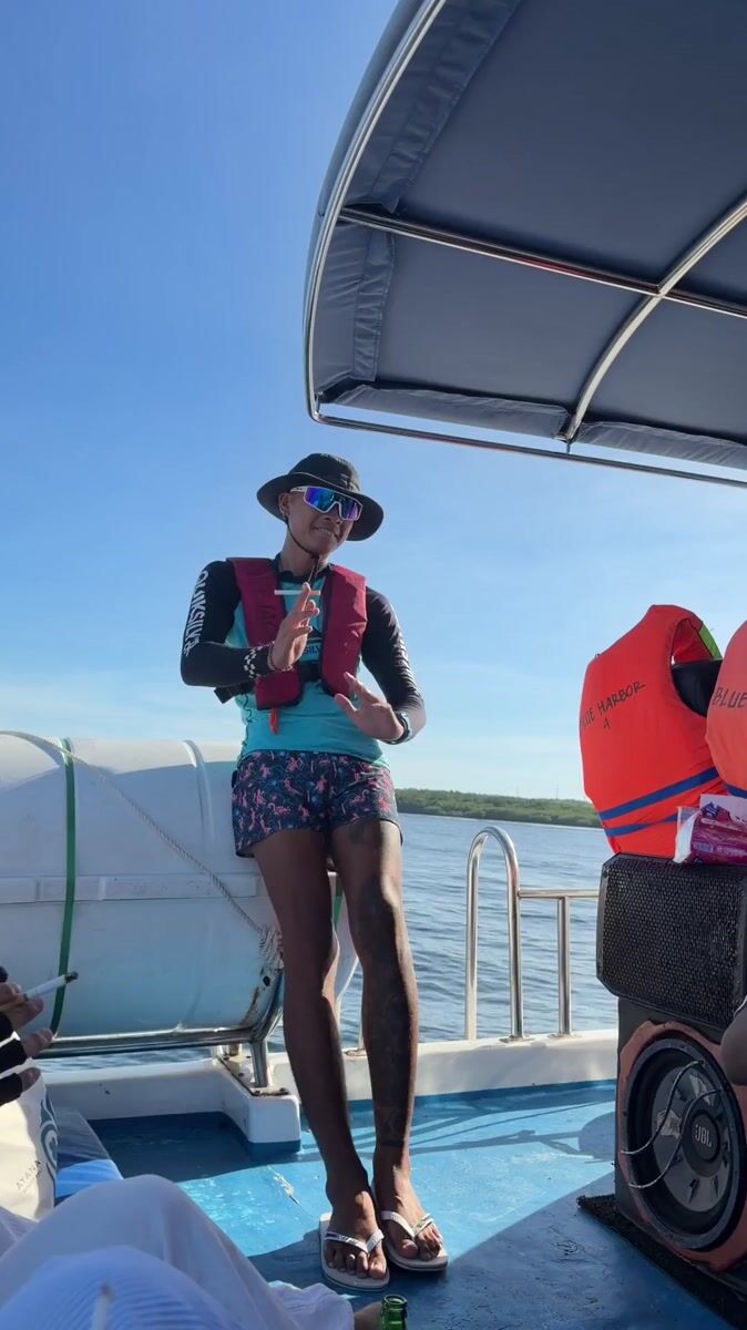Two young men pose on boat in Indonesian waters