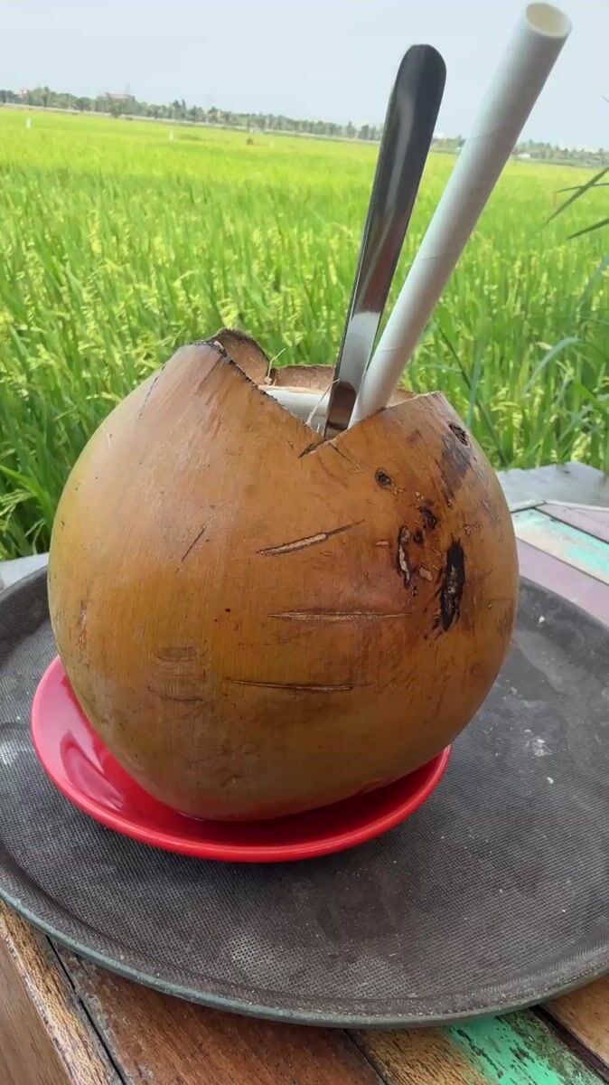 Topics: coconut drink, rice field, outdoor dining, breakfast, rural dining, agriculture, vietnamese culture, countryside, food, daily life
