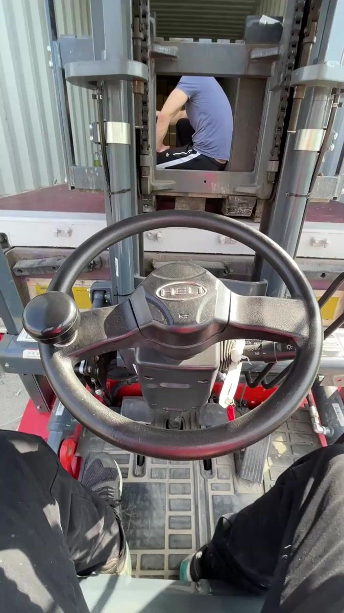 Topics: forklift operation, shipping container, cargo loading, warehouse work, industrial activity, logistics, transportation, labor, commercial, daily life