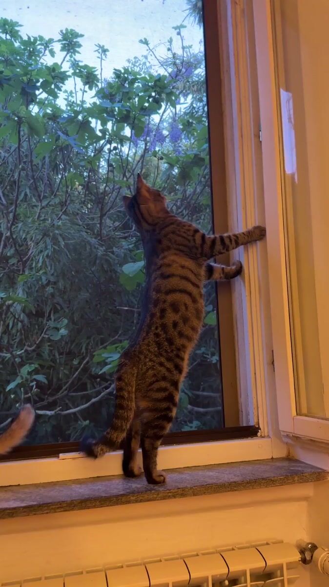 Two tabby cats watch purple flowering tree from Milan windowsill