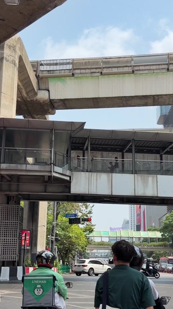 Topics: motorcycle camera, traffic light, elevated walkway, urban infrastructure, street scene, transportation, multilevel city, urban, daily life, southeast asia