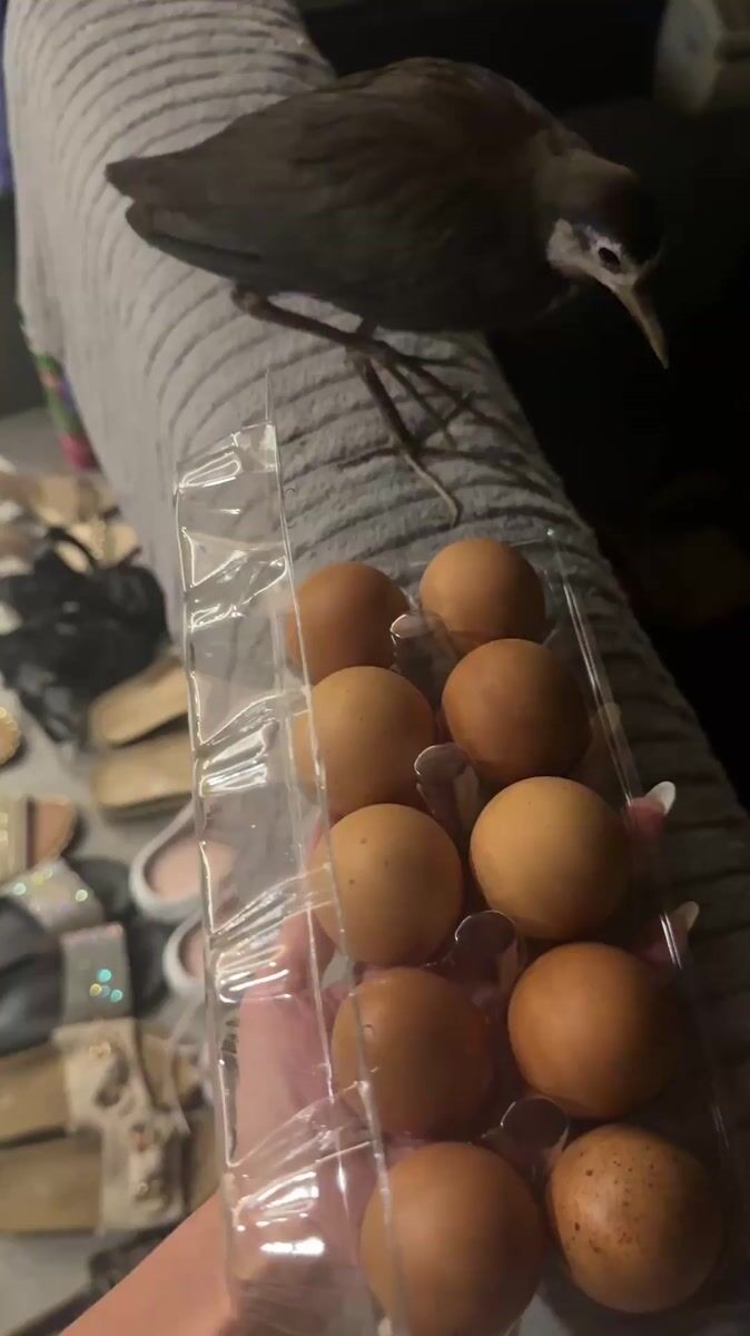 Topics: egg handling, bird interaction, indoor scene, animal behavior, domestic activity, food preparation, daily life, residential, human animal, mundane