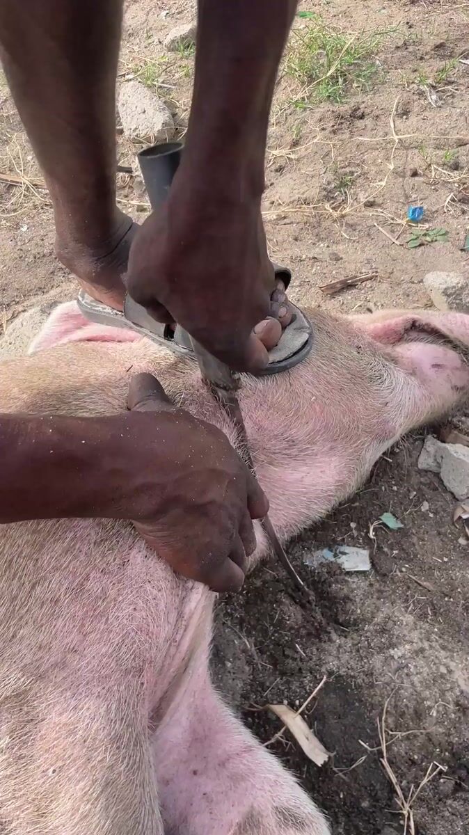 Topics: pig butchering, meat processing, outdoor slaughter, food preparation, traditional practice, livestock, agriculture, subsistence, rural life, daily life