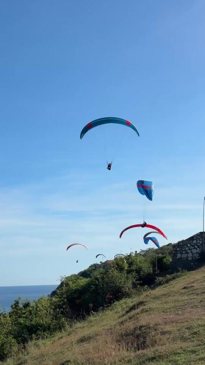 Topics: paragliding, coastal flight, morning launch, adventure sport, aerial activity, ocean view, recreation, outdoor, tourism, daily life