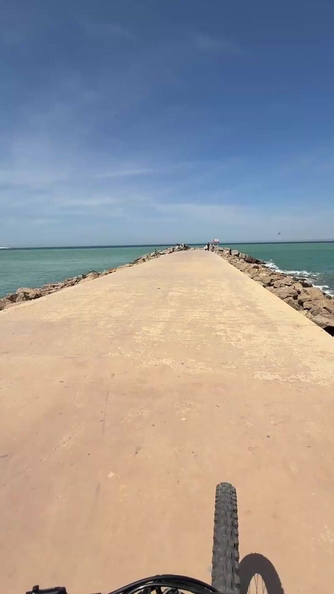 Cyclist rides concrete pier amid turquoise waters in Tangier