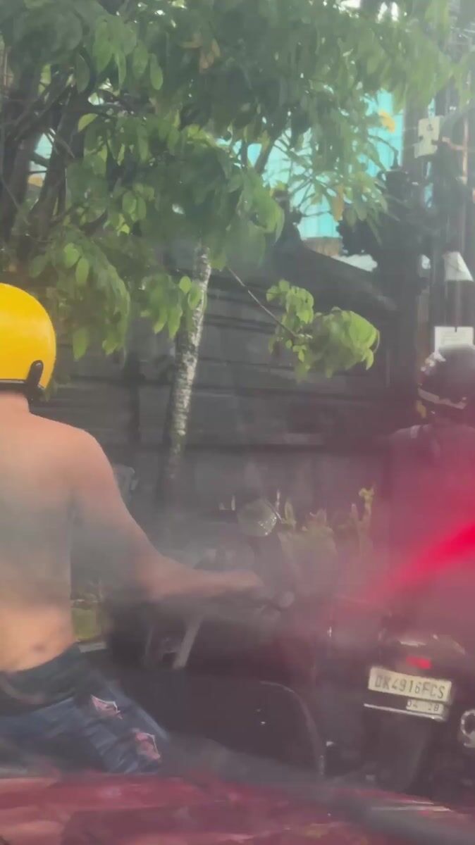 Topics: shirtless rider, scooter, yellow helmet, street scene, motorcycle transport, traffic, urban transport, daily life, street, transportation