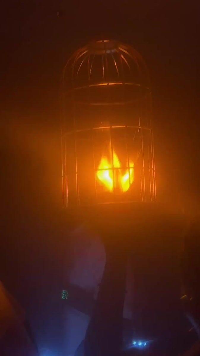 Topics: fire cage, birdcage performance, flame display, nightclub entertainment, bar performance, nightlife, entertainment, social gathering, urban nightlife, spectacle