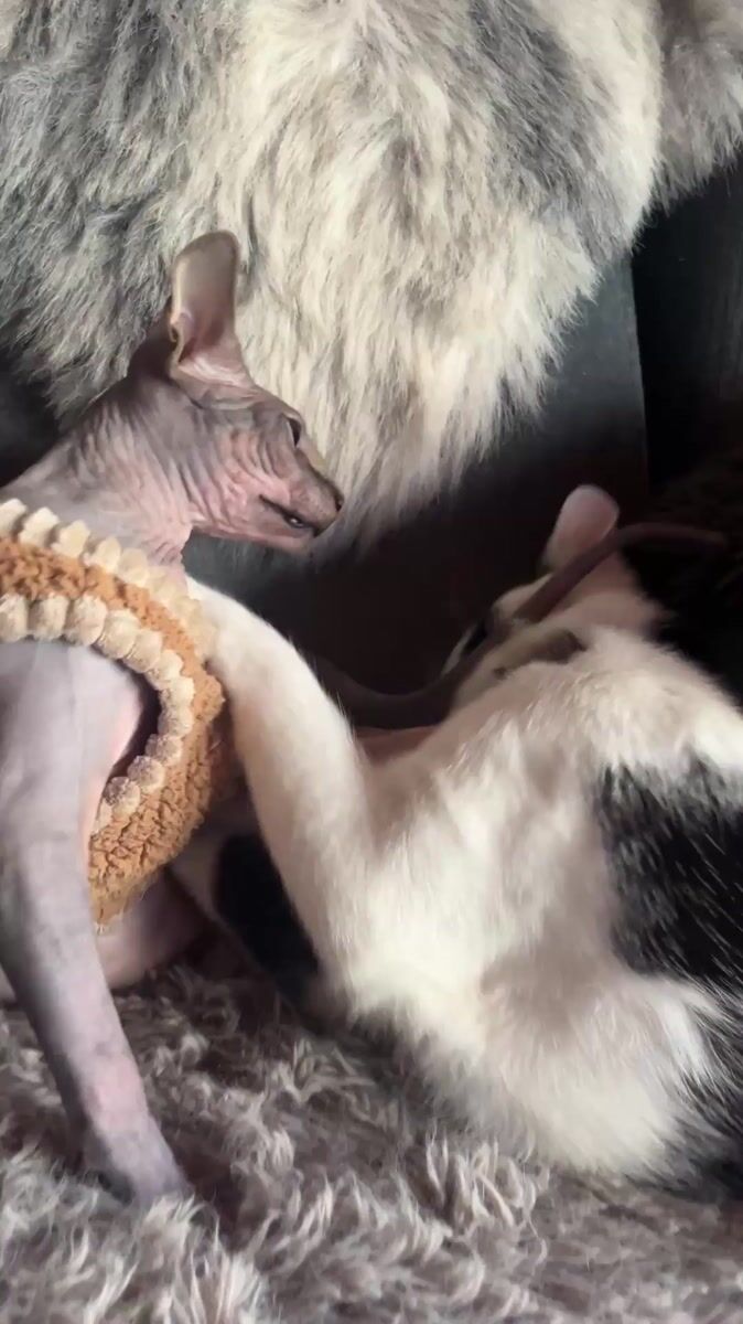 Topics: hairless cat, crocheted sweater, heart mug, domestic life, pet care, morning routine, home interior, daily life, personal, lifestyle