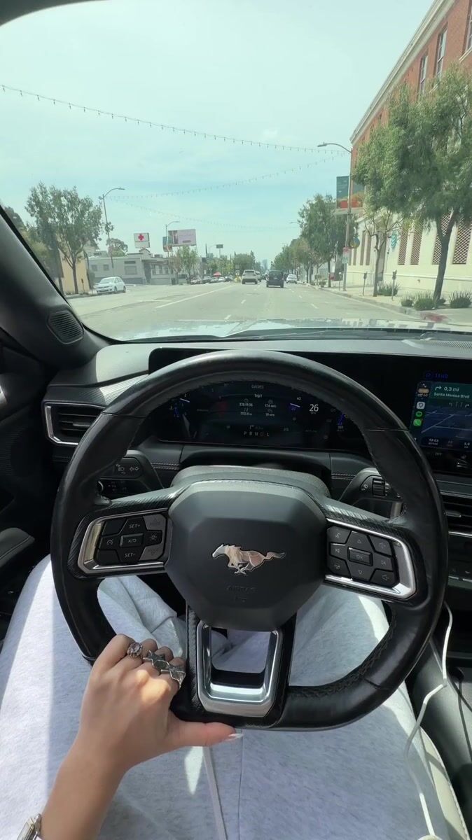 Topics: ford mustang, grey sweatpants, driver perspective, vehicle interior, automotive, driving, observation, urban, transportation, daily life