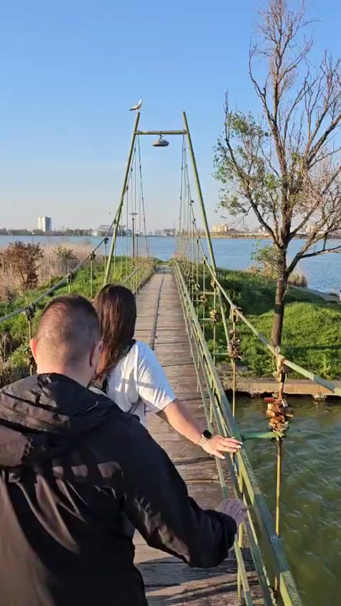 Topics: paddle boat, suspension bridge, waterfront park, recreation, outdoor activity, tourism, leisure, park, urban, daily life