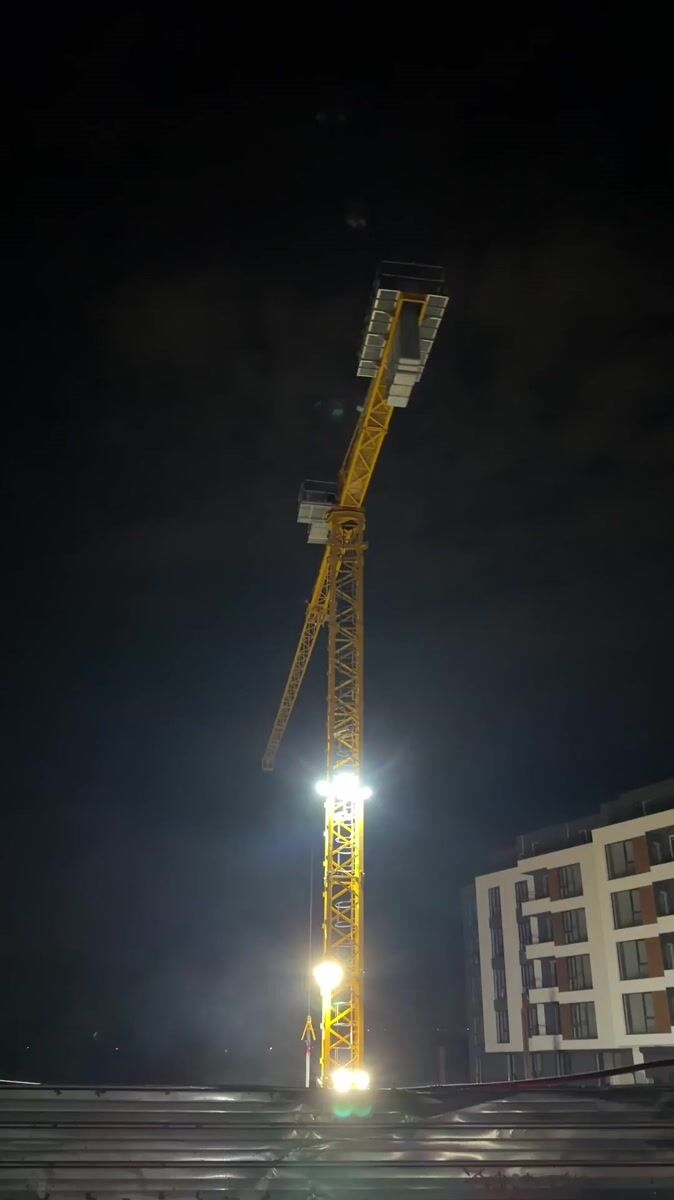 Topics: construction crane, night illumination, yellow crane, construction site, urban development, residential building, nighttime, infrastructure, urban, development
