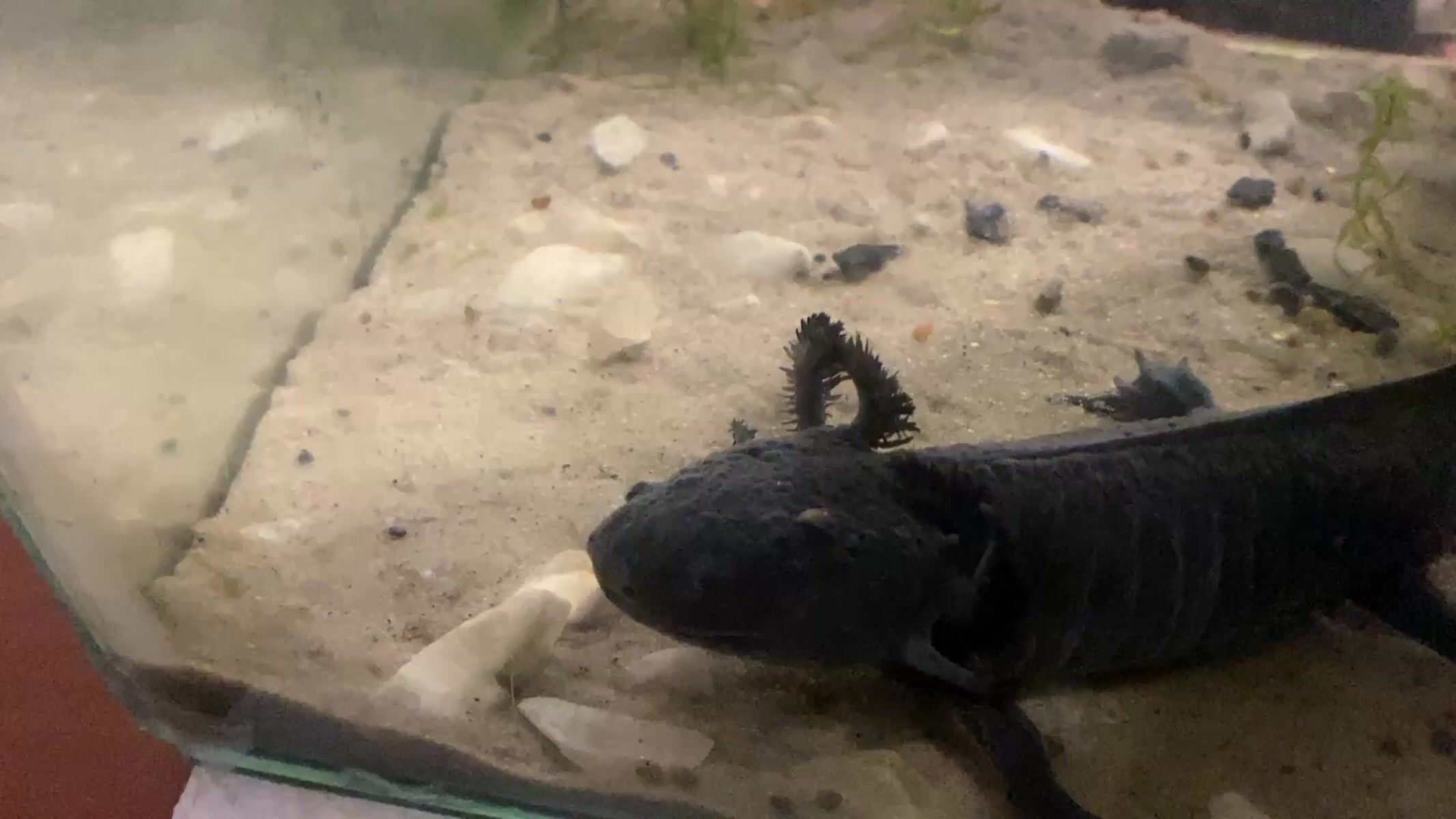 Topics: black axolotl, aquarium tank, aquatic pet, exotic animal, pet keeping, amphibian, captive wildlife, animal care, urban pet, daily life