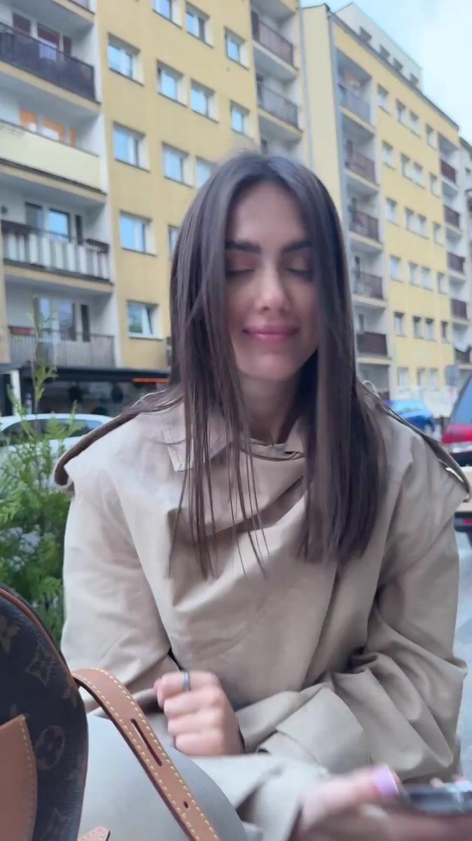 Topics: selfie, outdoor cafe, trench coat, street photography, urban lifestyle, social media, fashion, daily life, urban, social