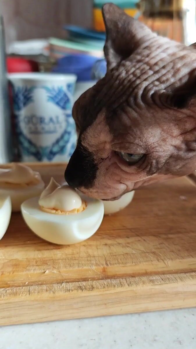 Topics: sphynx cat, deviled eggs, kitchen breakfast, pet eating, domestic scene, morning routine, home life, animal behavior, daily life, indoor