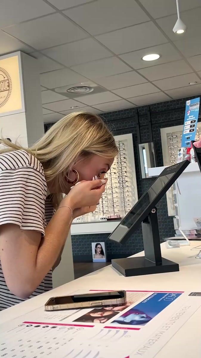 Woman struggles with contact lenses at optician in Saint-Galmier