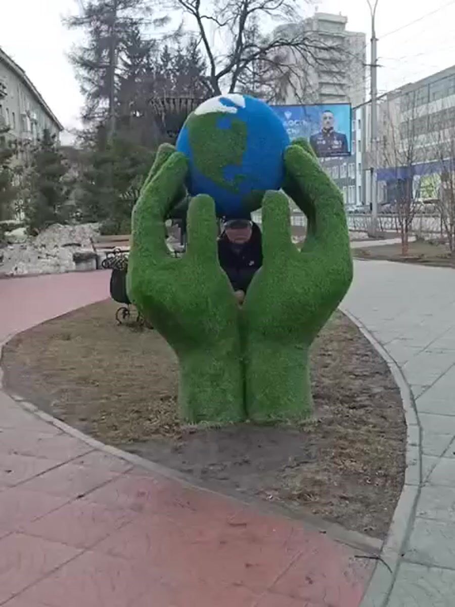 Topics: globe sculpture, wet sidewalk, bicycle delivery, early morning, street scene, public park, pedestrian, urban life, daily life, siberian city
