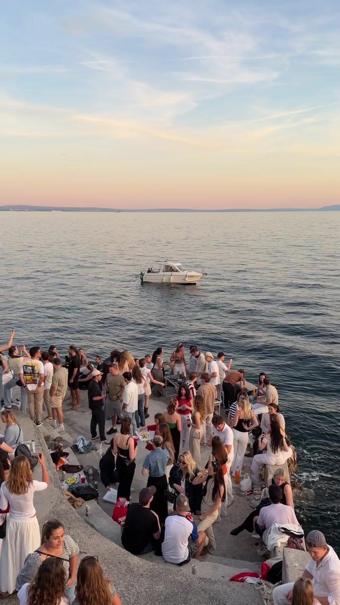 Topics: waterfront gathering, sunset fishing, adriatic pier, evening social, coastal activity, community, recreational, waterfront, social, daily life