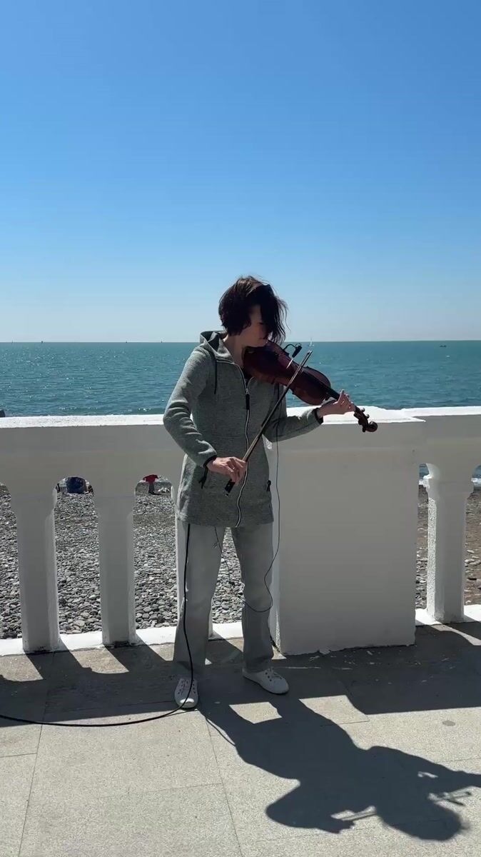Topics: violin performance, street musician, waterfront music, busking, outdoor performance, seaside, street art, music, coastal, daily life