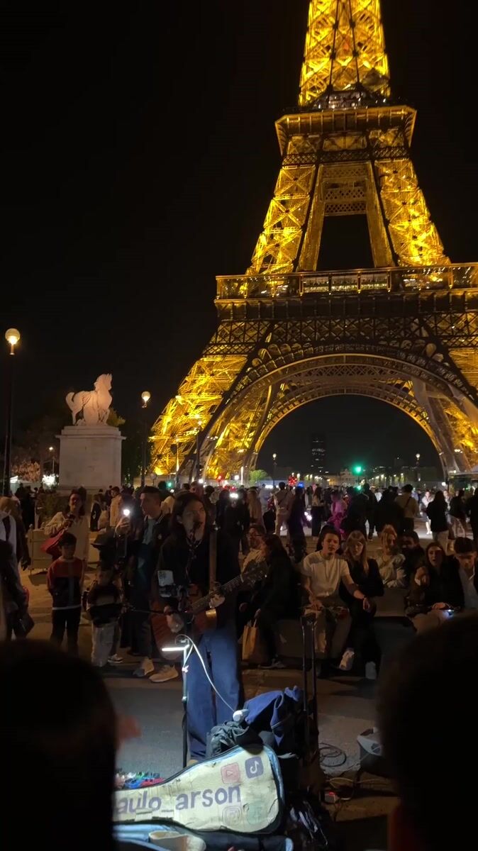 Street musician draws crowd performing near illuminated Eiffel Tower