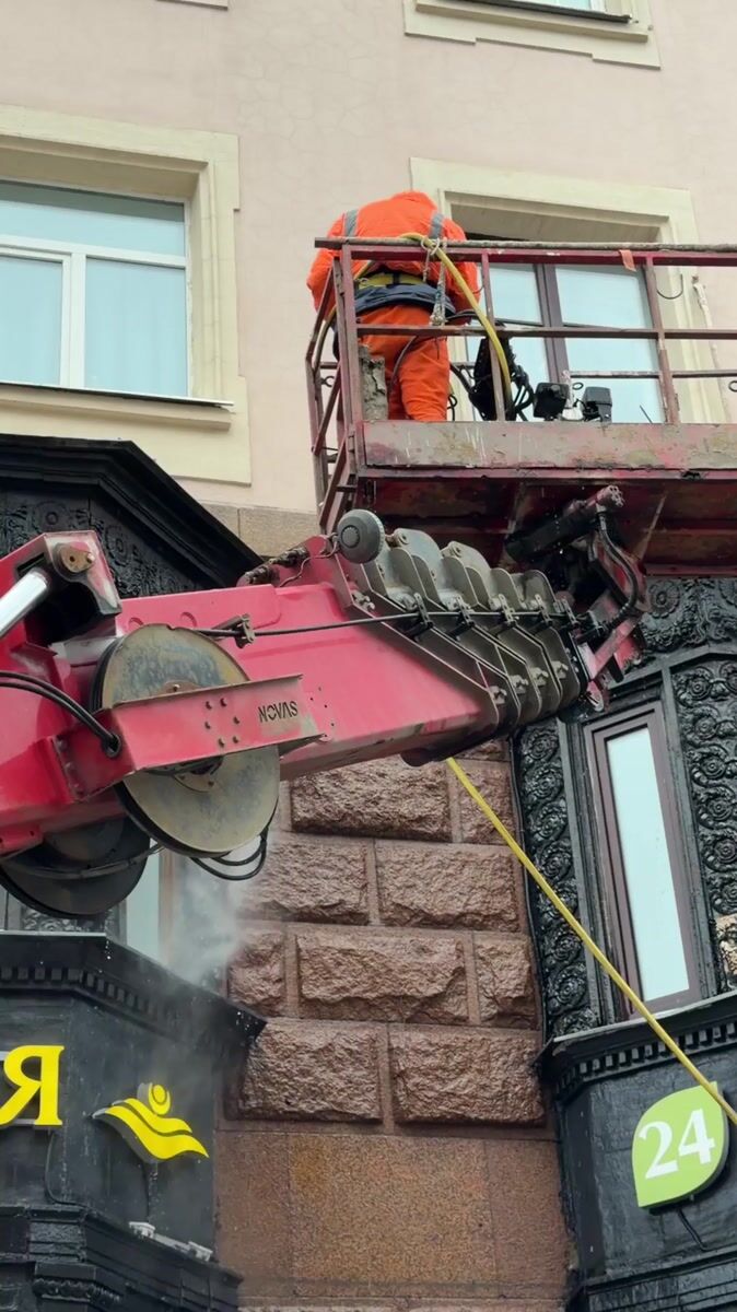 Topics: building maintenance, cherry picker, dog walking, statue, plaza, morning routine, urban life, daily life, pedestrian, moscow