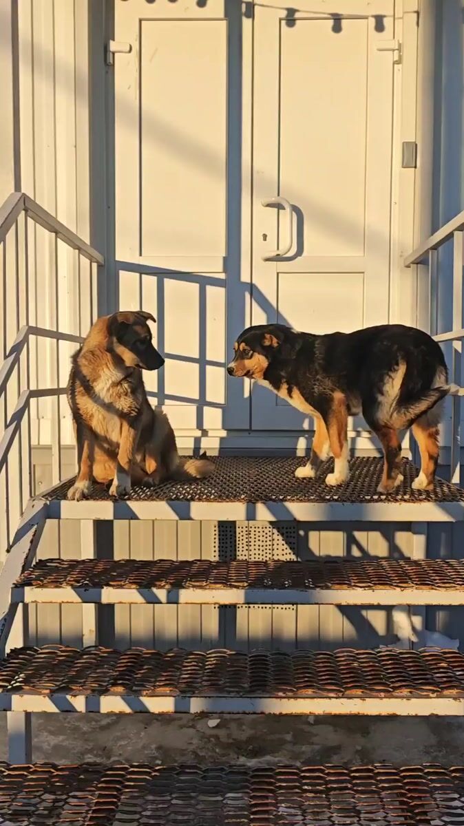 Topics: stray dogs, metal stairs, street animals, urban wildlife, residential area, municipal space, animal behavior, street life, urban, daily life