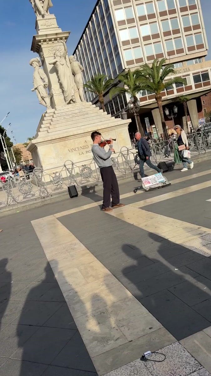 Topics: violin performance, street musician, plaza music, busking, street performance, public art, urban entertainment, street life, cultural activity, daily life