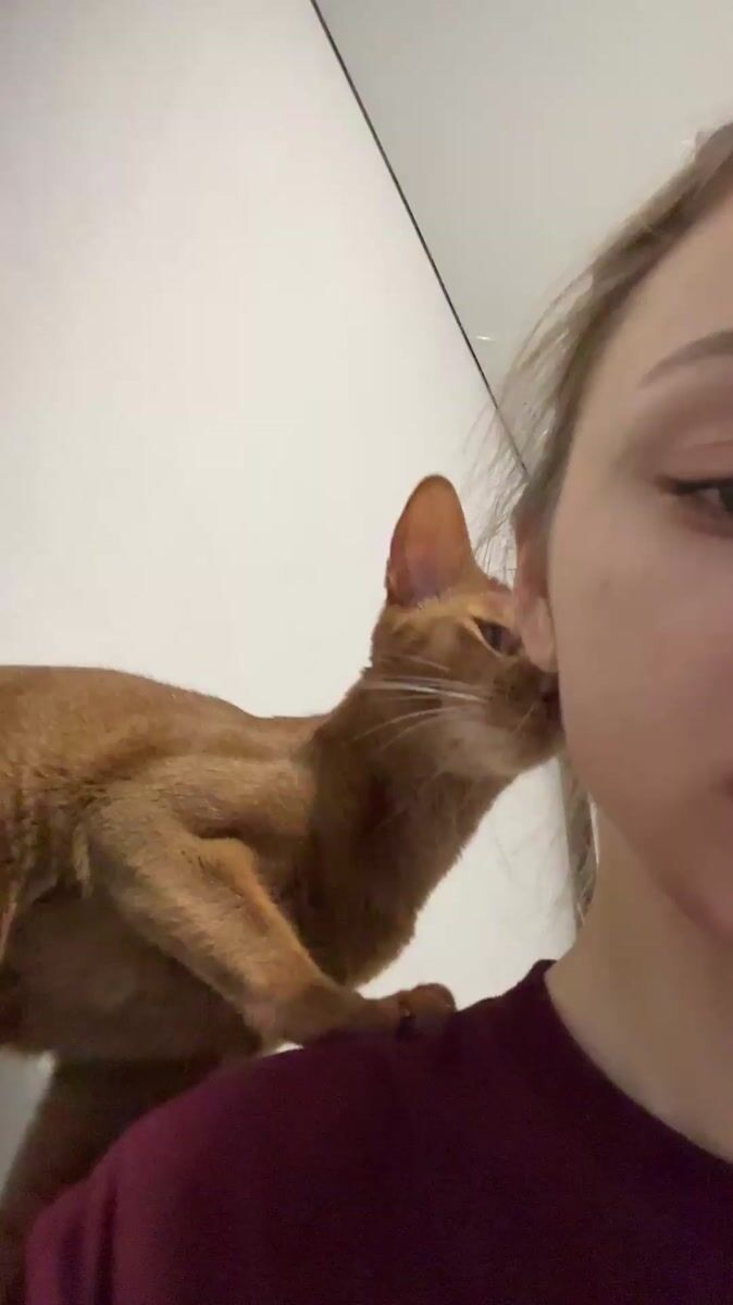 Topics: cat nuzzling, shoulder perch, orange cat, pet interaction, animal behavior, morning scene, companion animal, domestic, daily life, urban