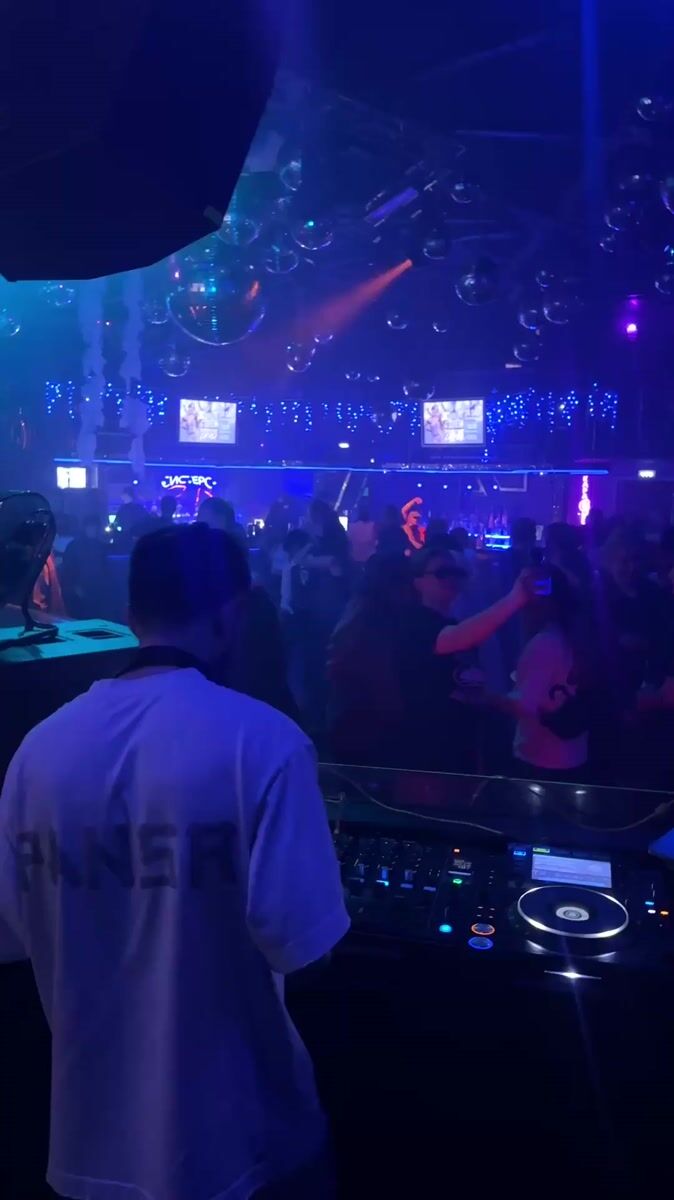 Topics: dj performance, nightclub, disco lighting, electronic music, late night, entertainment, nightlife, social, urban, culture