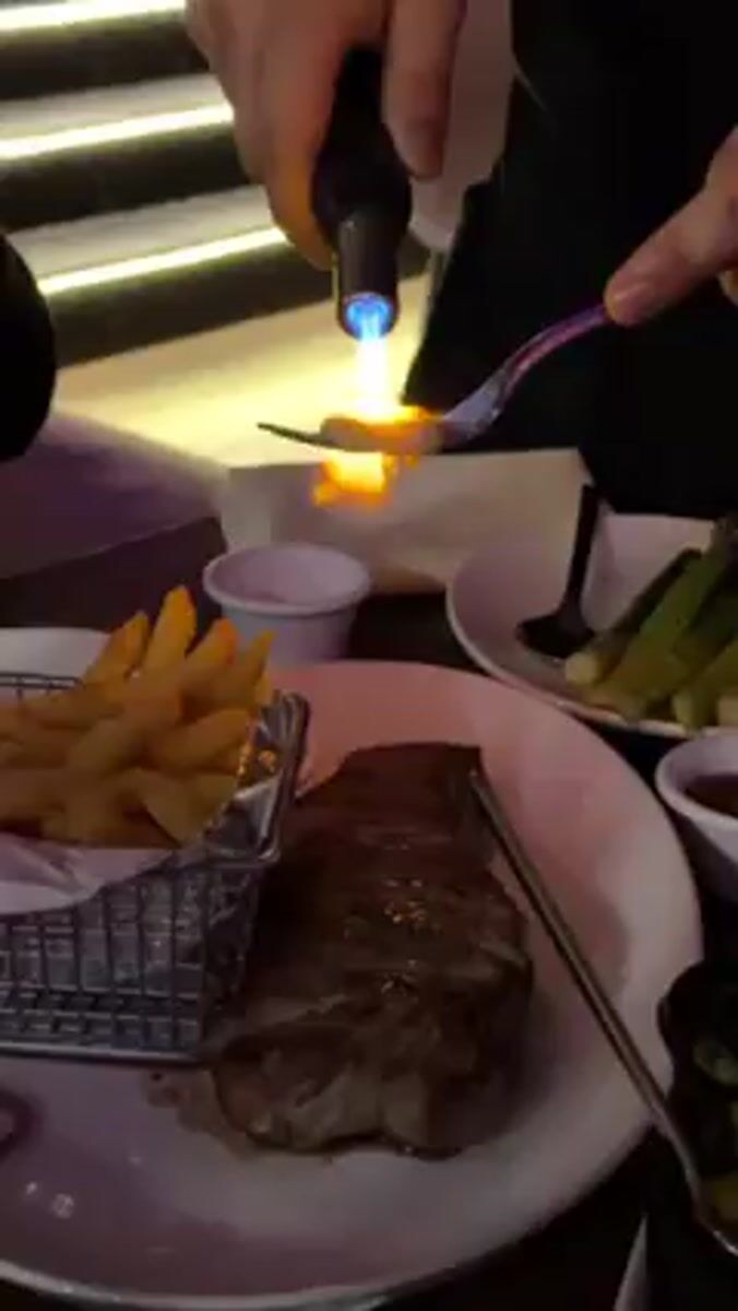 Topics: blowtorch cooking, steak preparation, torch finishing, fine dining, restaurant meal, culinary technique, food preparation, dining, gastronomy, urban