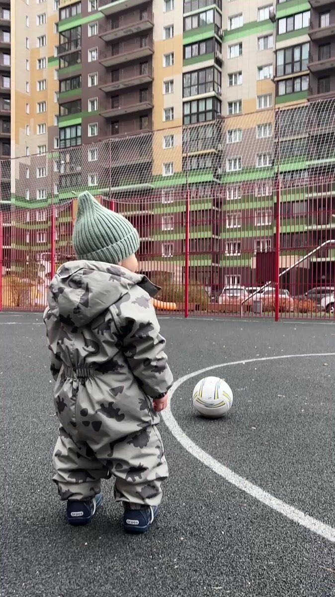 Topics: soccer ball, toddler play, breakfast table, sports court, morning routine, family time, residential, outdoor activity, daily life, domestic