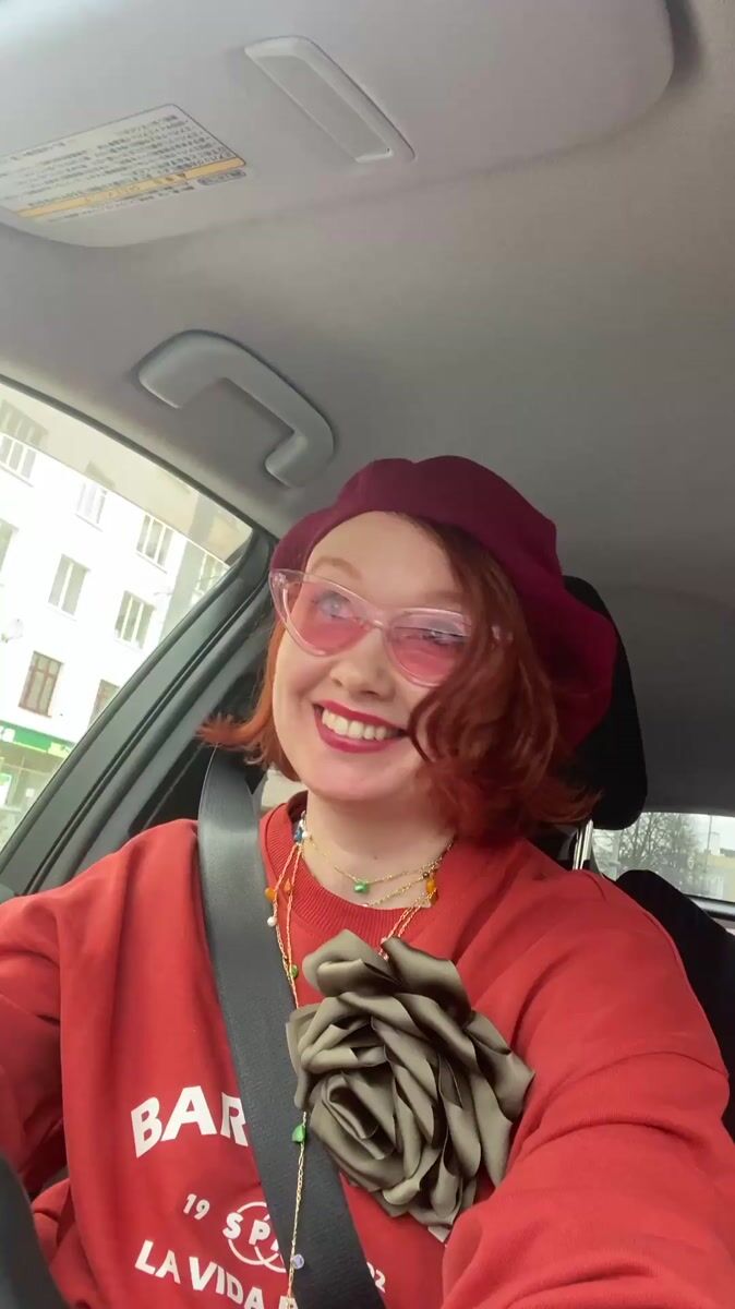 Woman in red beret drives through Yekaterinburg