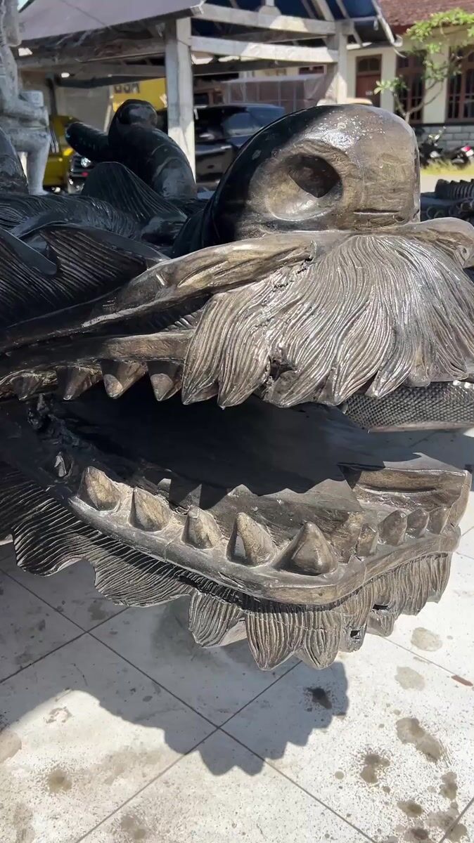 Topics: wooden sculpture, dragon bench, traditional carving, tourist photography, cultural attraction, art display, tourism, cultural heritage, travel, daily life