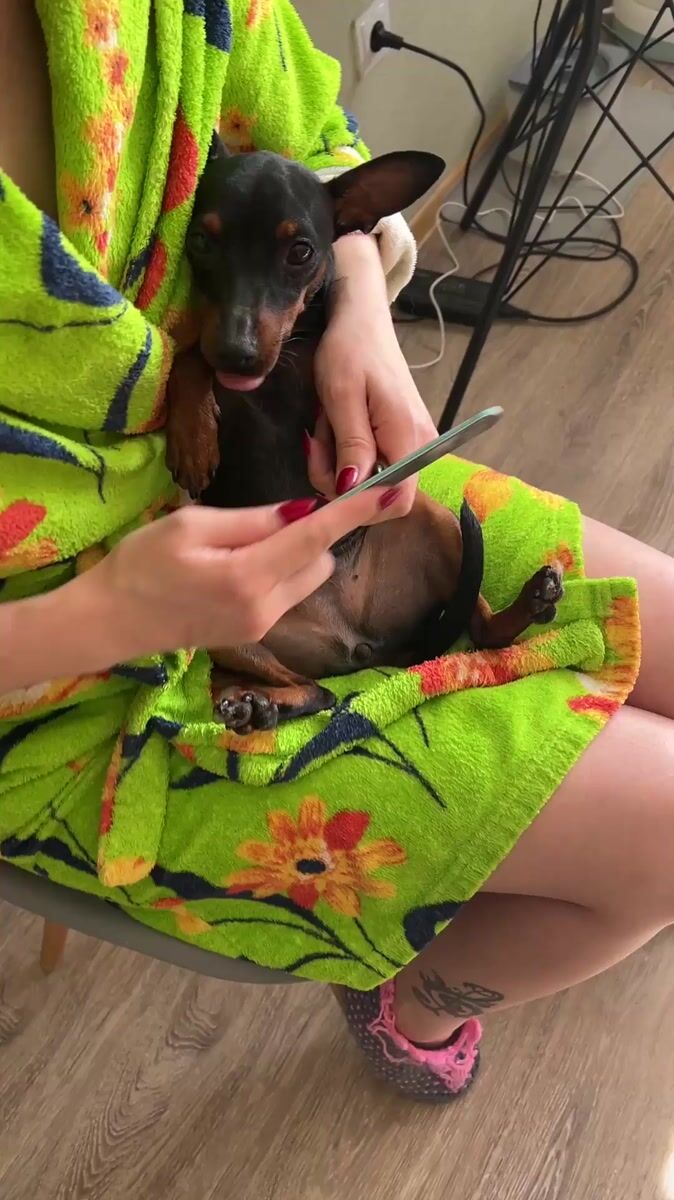 Topics: nail trimming, dog grooming, pet care, domestic animal, home activity, morning routine, pet bonding, daily life, indoor, personal care