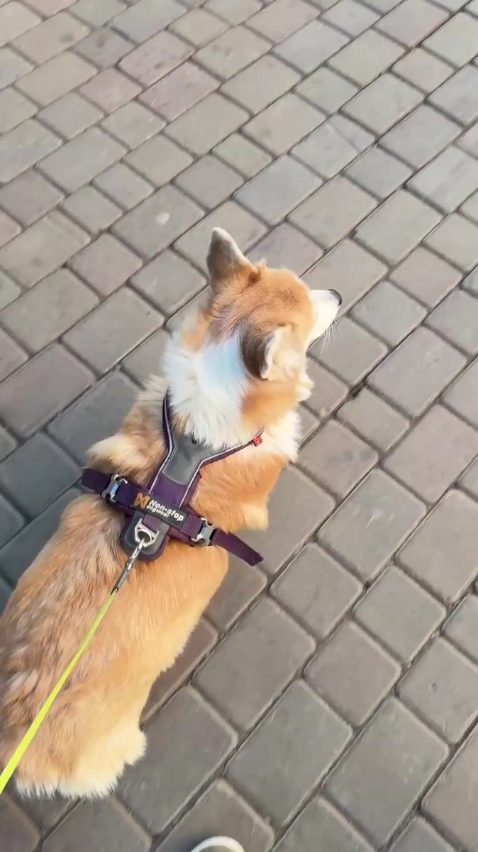 Topics: corgi walk, dog harness, morning walk, pet exercise, urban park, dog walking, pets, outdoor, daily life, domestic