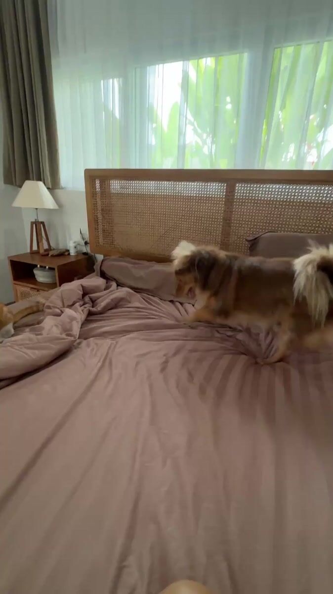 Topics: cat dog play, pet interaction, bedroom scene, animal behavior, domestic pet, indoor activity, animal companionship, daily life, home, lifestyle