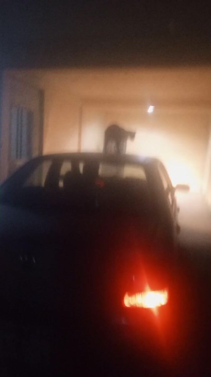 Topics: cat on car, garage scene, parked vehicle, pet behavior, residential, nighttime, venezuela, daily life, urban, animal