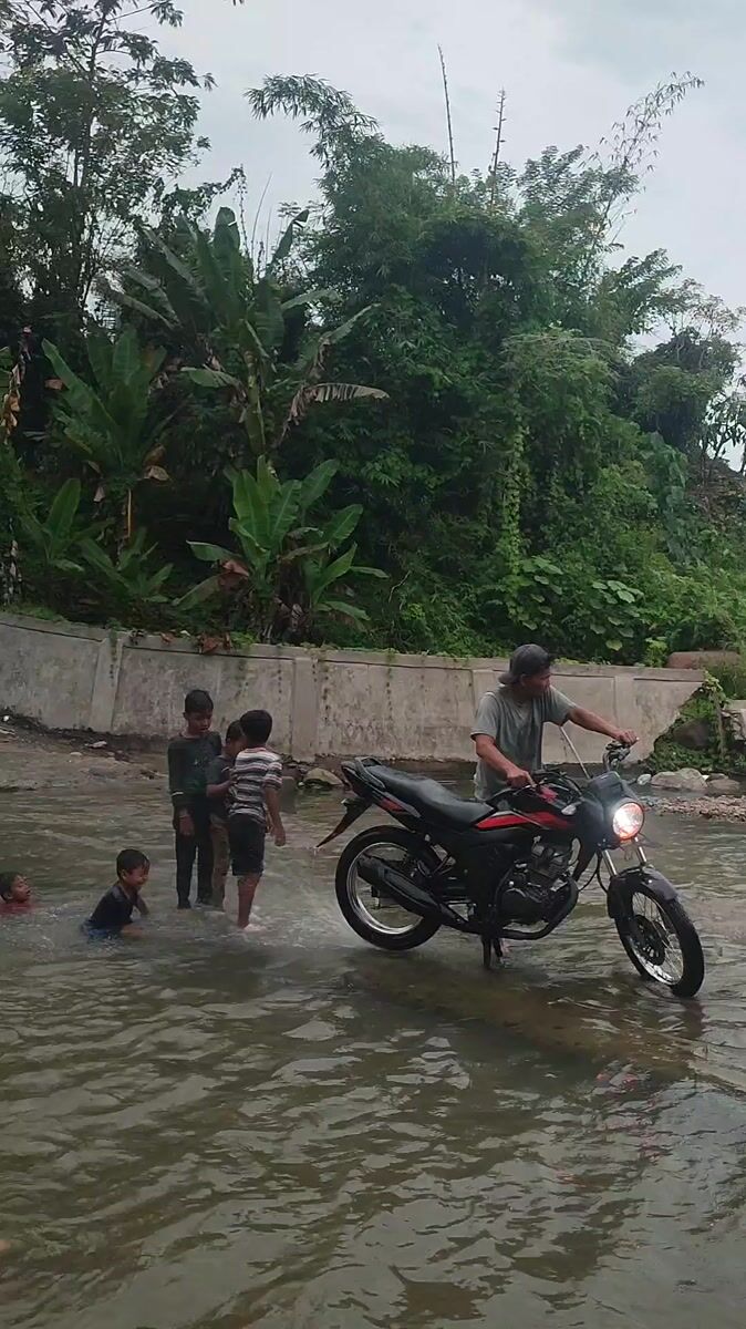 Topics: children swimming, motorcycle crossing, river play, village life, tropical setting, community activity, water recreation, rural scene, daily life, indonesia