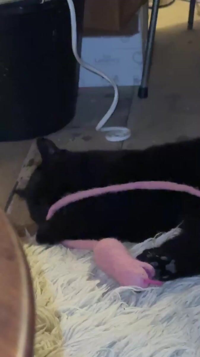 Topics: cat toy, black cat, pink mouse, indoor play, pet behavior, domestic scene, animal, home life, daily life, lifestyle