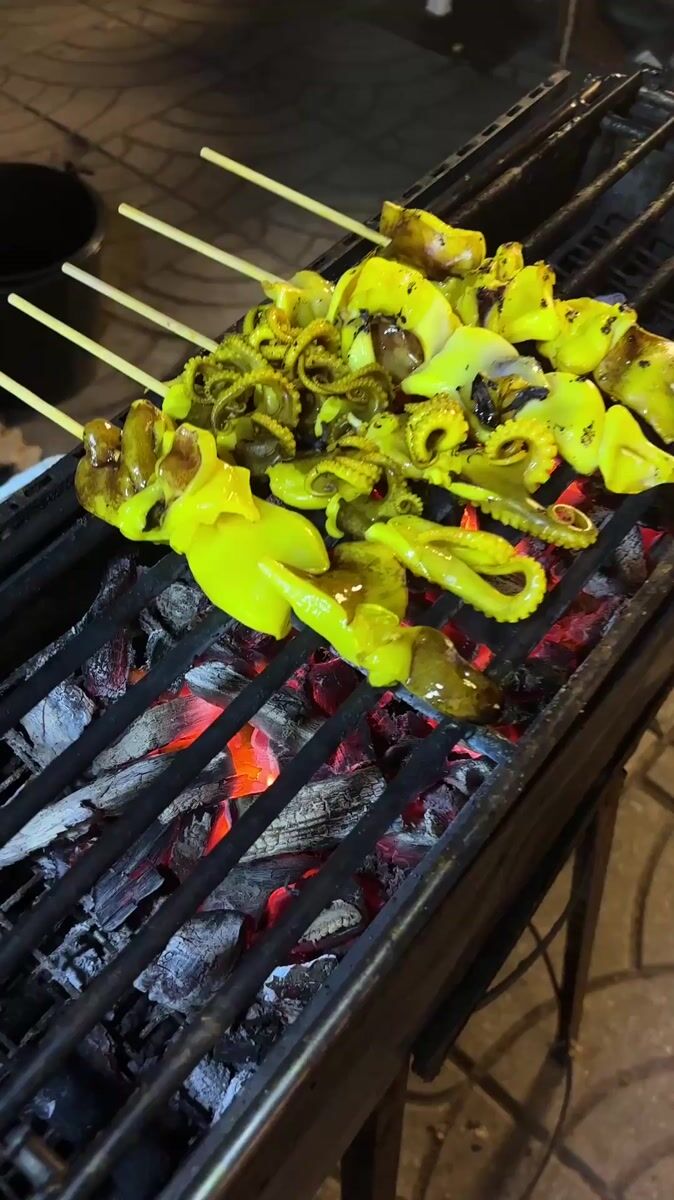 Topics: night market, street food, grilled squid, coconut vendor, food stall, thai cuisine, vendor, market, food, daily life