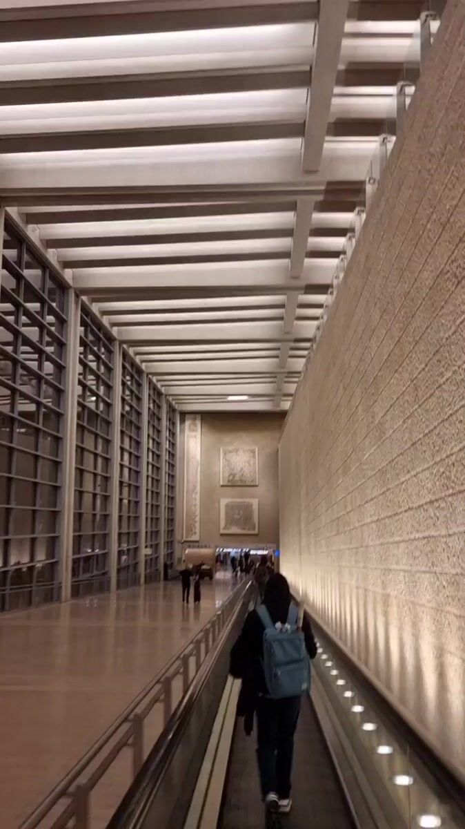 Topics: moving walkway, backpack traveler, airport terminal, pedestrian, transport hub, late night, urban transit, travel, infrastructure, daily life