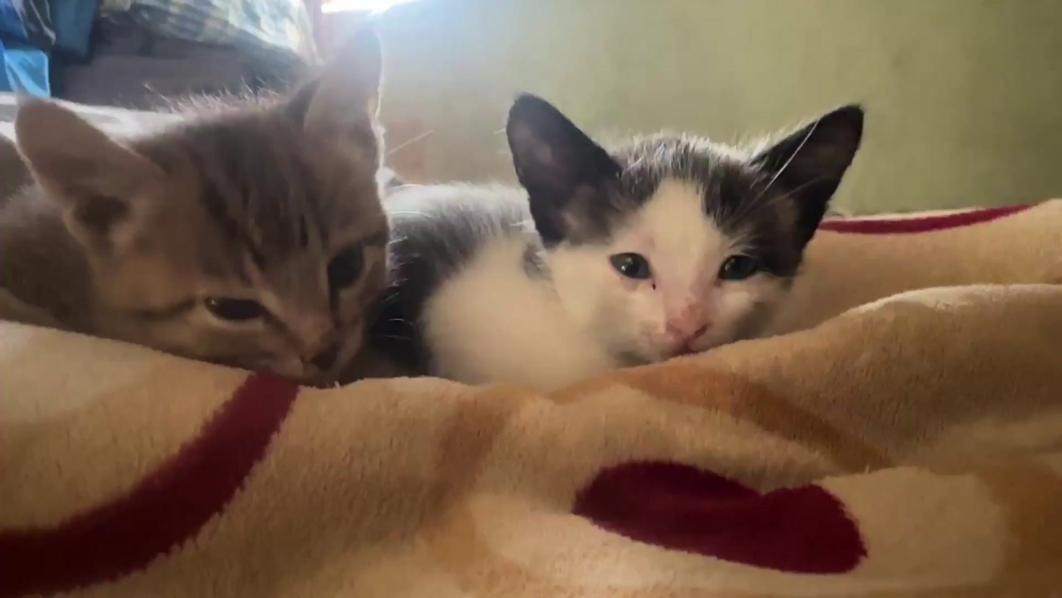 Two kittens documented resting together on blanket in Jos