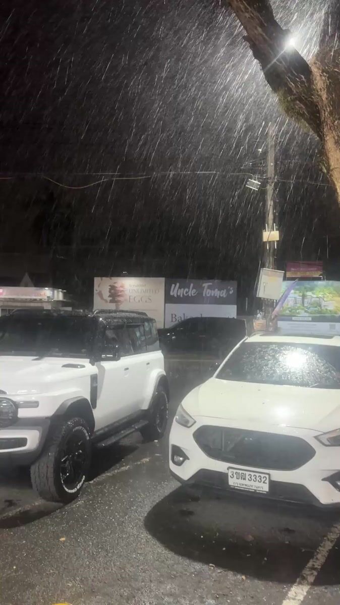 Topics: ukulele performance, rainy street, musical duo, street parking, live music, nighttime scene, entertainment, weather, urban, daily life