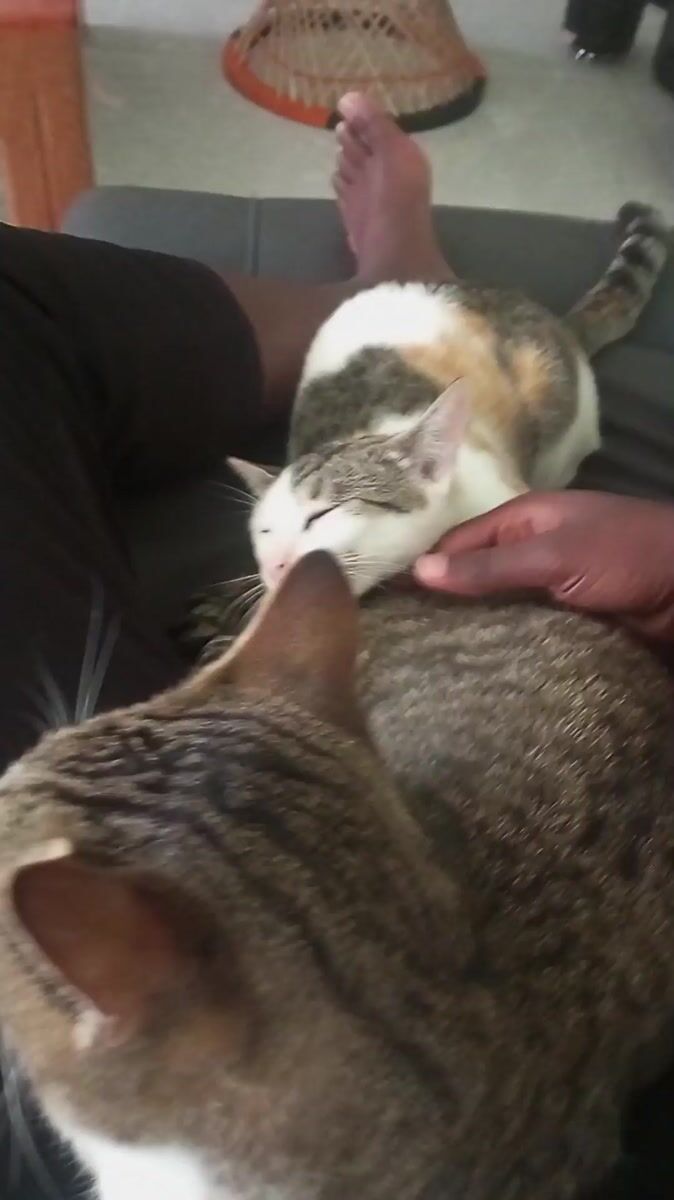 Topics: sleeping cats, couch relaxation, pet companionship, domestic scene, indoor leisure, animal behavior, home life, comfort, daily life, domestic