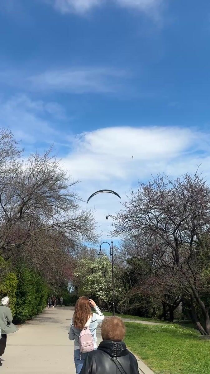 Topics: paragliding, blue sky, bare trees, aerial sport, spring day, outdoor recreation, aviation, nature, leisure, urban