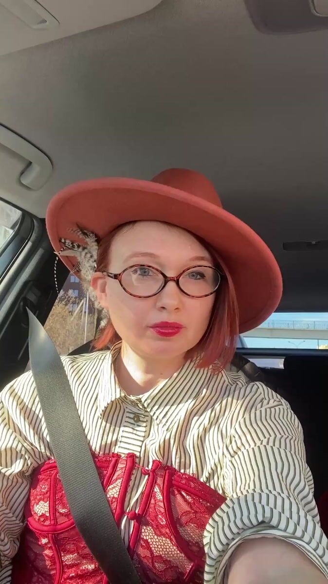 Woman in feathered hat, period costume observed in Yekaterinburg car