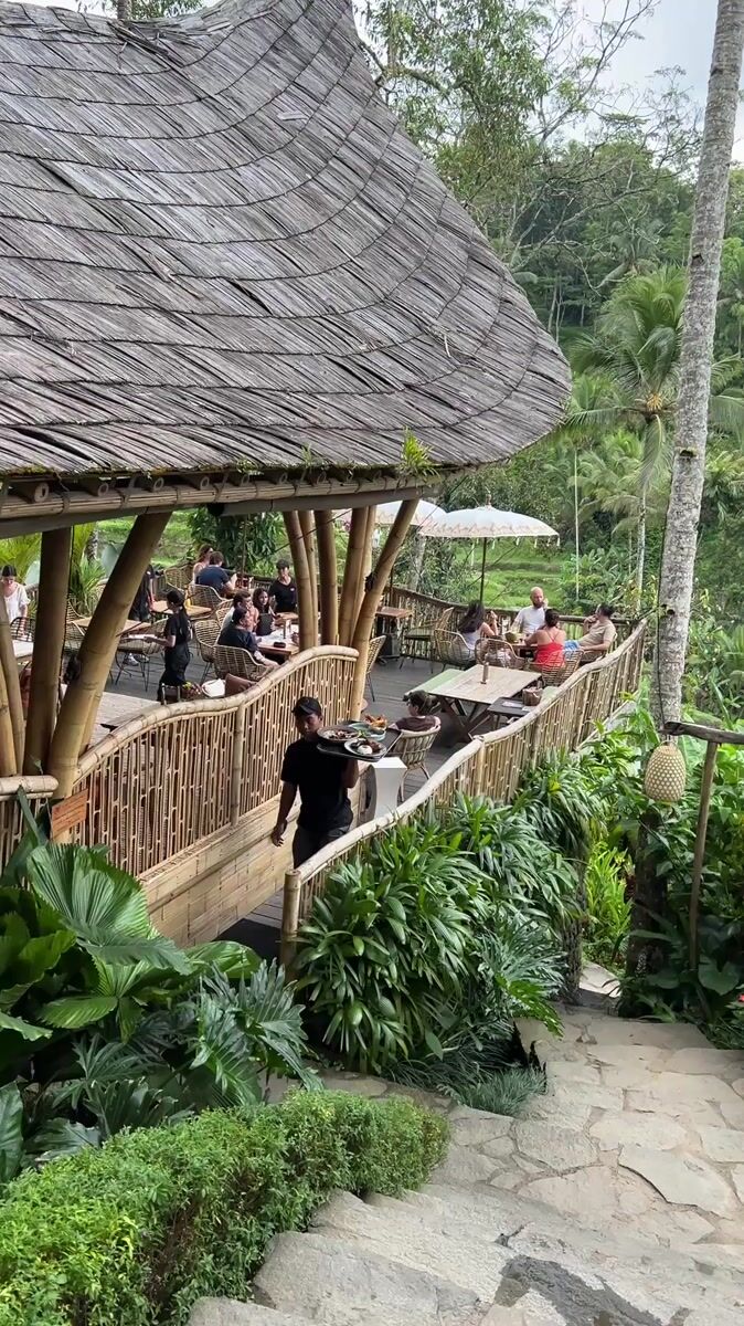 Topics: rice terraces, bamboo restaurant, outdoor dining, tourism, tropical dining, resort, sightseeing, landscape, hospitality, culture