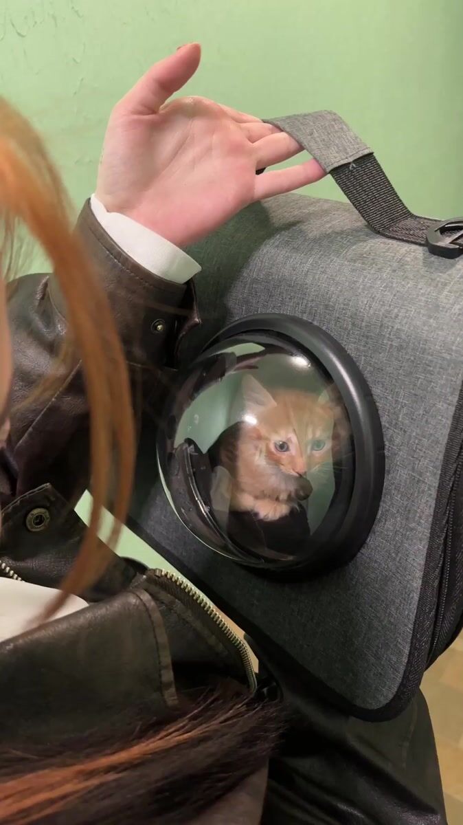 Topics: pet carrier, orange kitten, bubble backpack, pet transport, animal care, street scene, urban pets, daily life, social, moscow