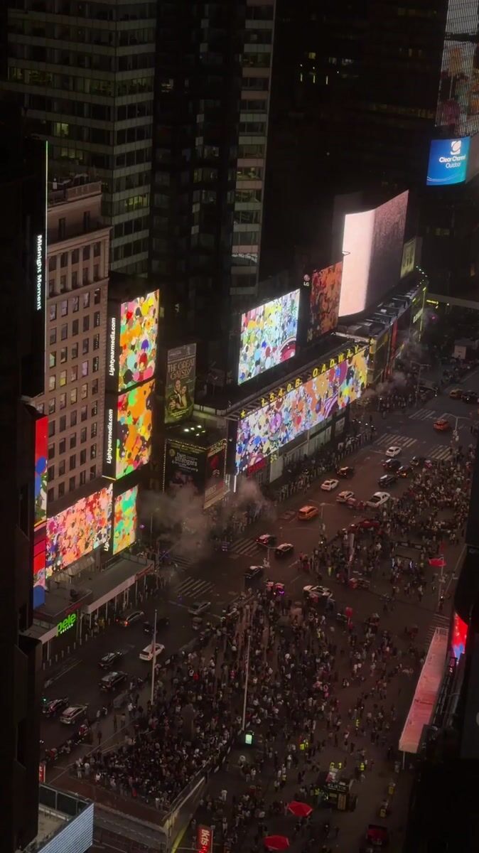 Topics: times square, aerial view, night crowds, street traffic, nightlife, urban activity, city center, pedestrian, tourism, urban
